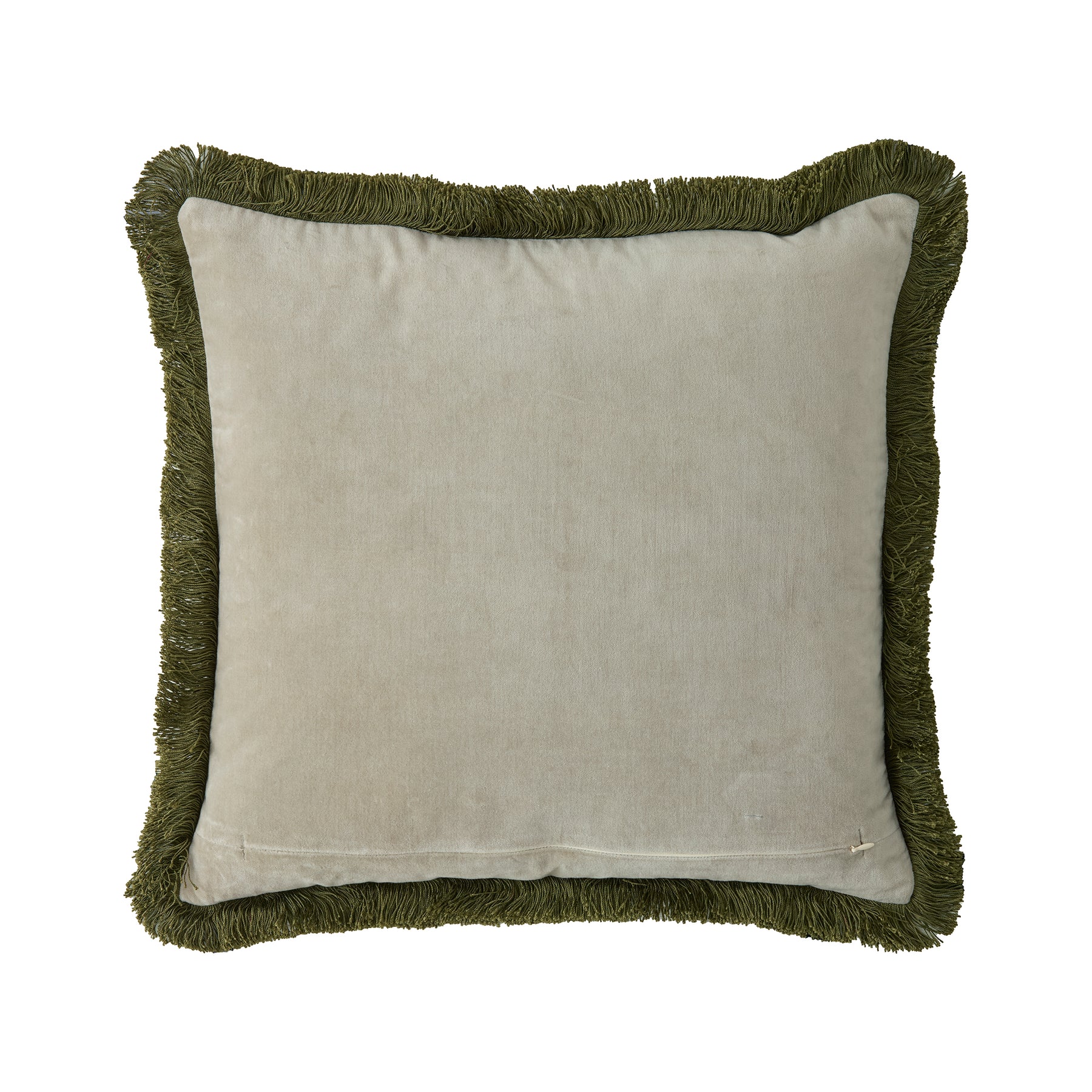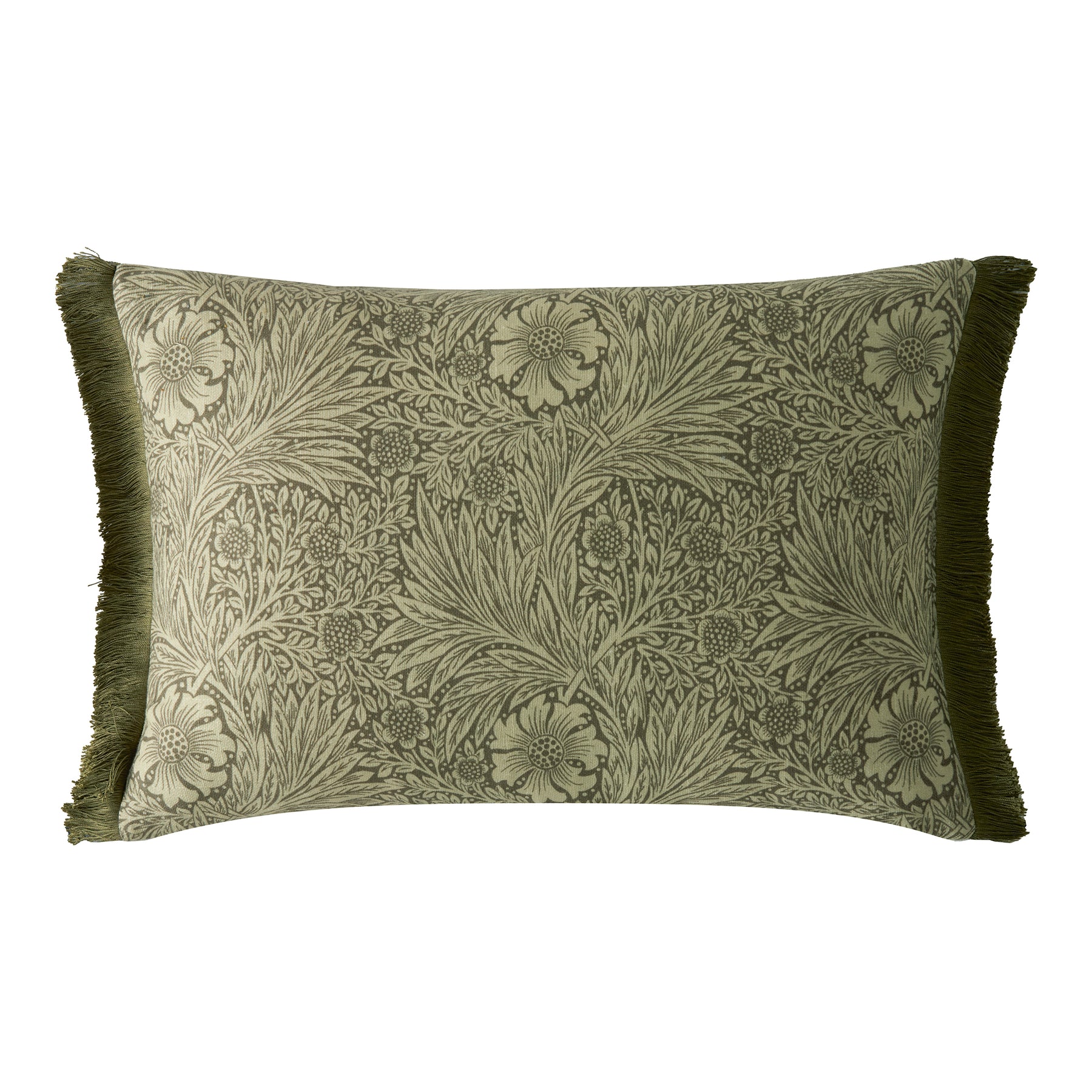 Marigold was designed by William Morris and registered as a wallpaper in 1875.  The pattern incorporates larger marigold flowers amongst sprays of willow like leaves, against a backdrop of smaller foliage and flowers.  Colored in a deep, olive-green palette and printed onto a linen-look cotton base, this timeless cushion has a coordinating plain dyed cotton velvet reverse, in a soft sage color.