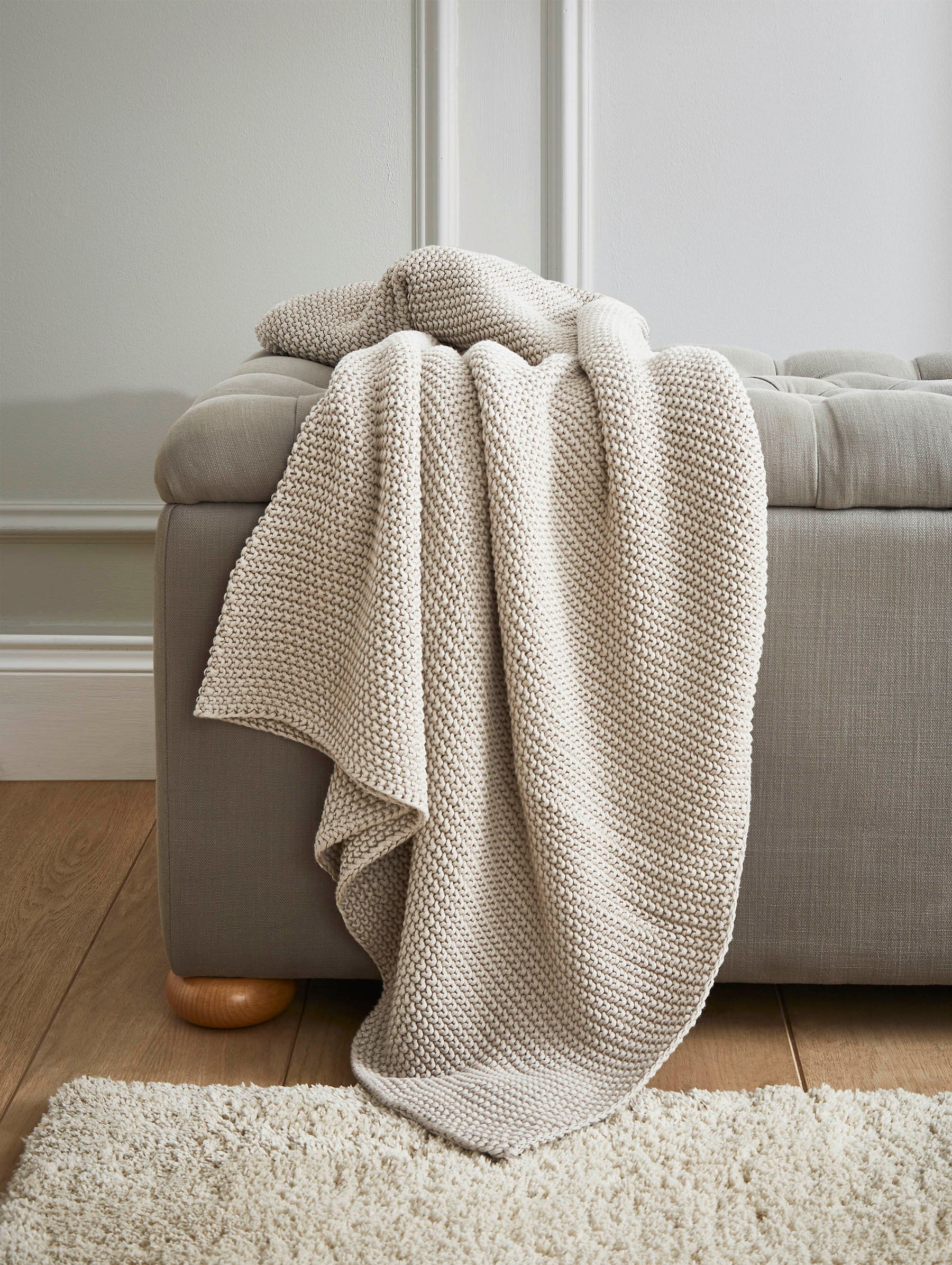 Soft and sumptuous, this chunky textured cotton knit in timeless Laura Ashley sage green or dove grey looks fabulous and always offers an extra layer of cosiness come bedtime.