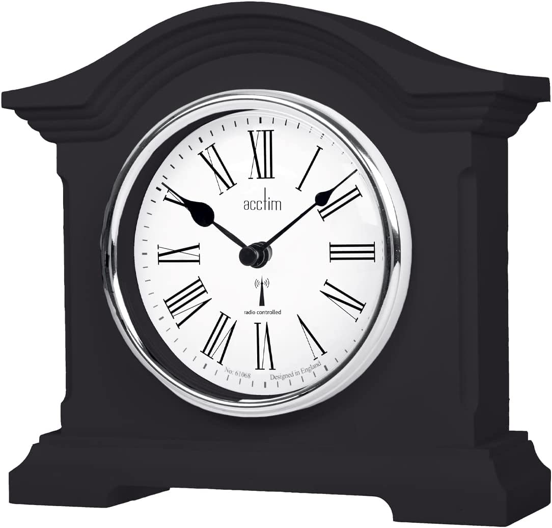 A traditional arch top design with clear white dial, Roman numerals and chrome highlights