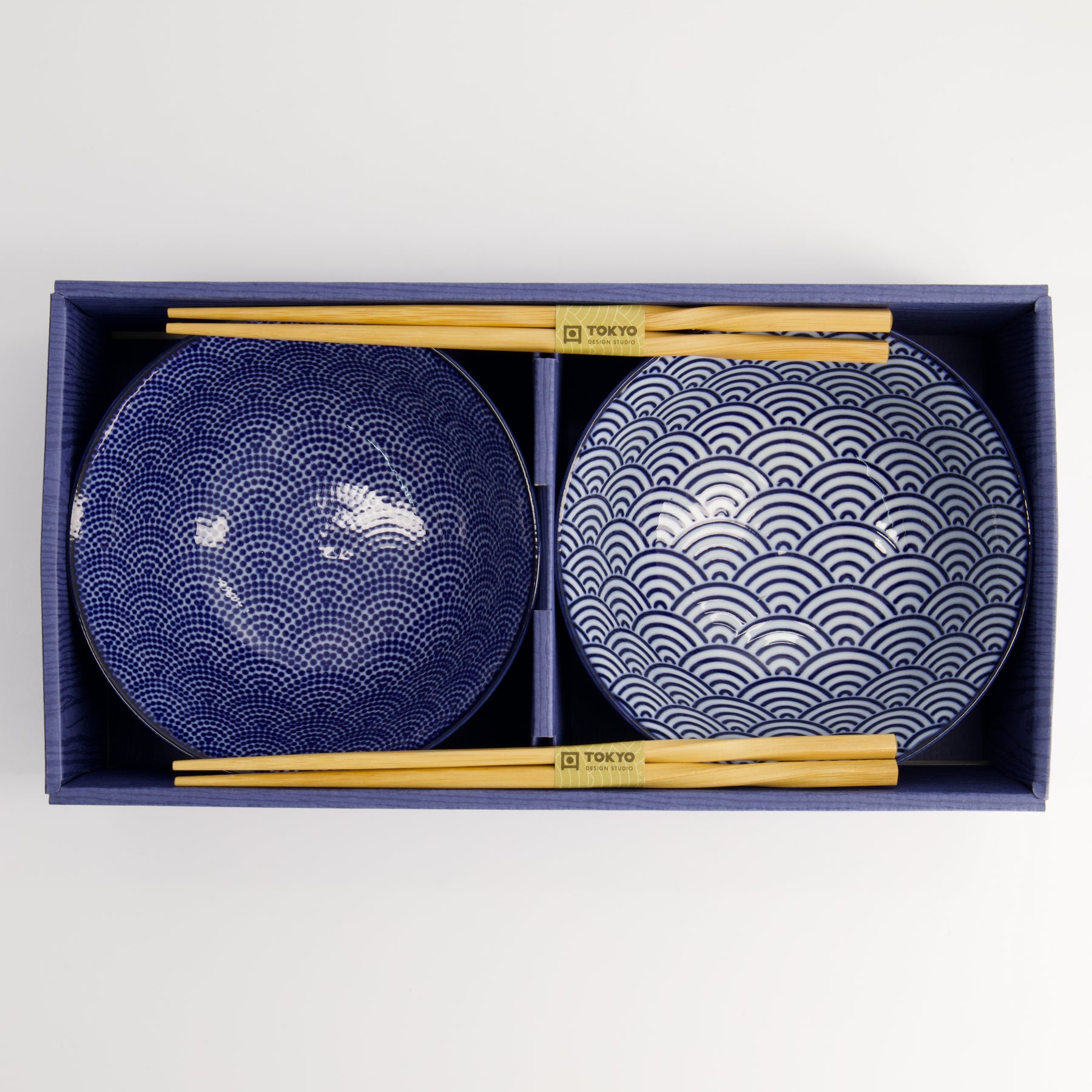 Bring a touch of Japanese elegance to your table with the Tokyo Design Studio Nippon Blue Tayo Bowl Gift Set. This beautiful set includes two porcelain bowls, each featuring a mix of the signature Dots and Wave patterns from the Nippon Blue collection, paired with matching chopsticks.