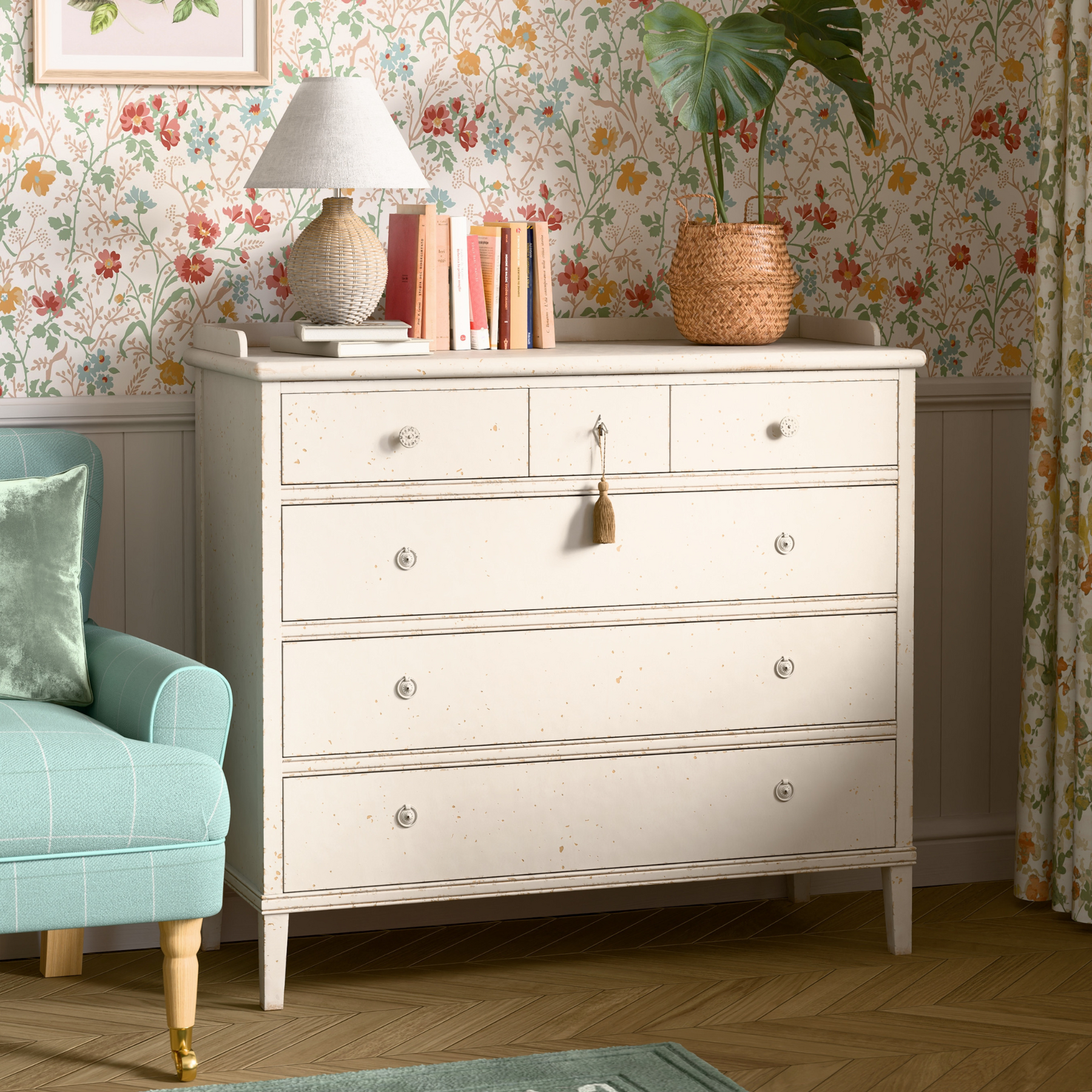 Timeless and romantic, the Laura Ashley Annaside 3 + 3 Drawer Chest is the perfect addition to your home. With a whimsical French flair, this gorgeous chest features 3 deep drawers offering plenty of space, finished with painted ring handles and a gold tassel. Crafted from solid poplar, this piece features an antique white paint finish, carefully hand-distressed to provide the look of an heirloom piece.