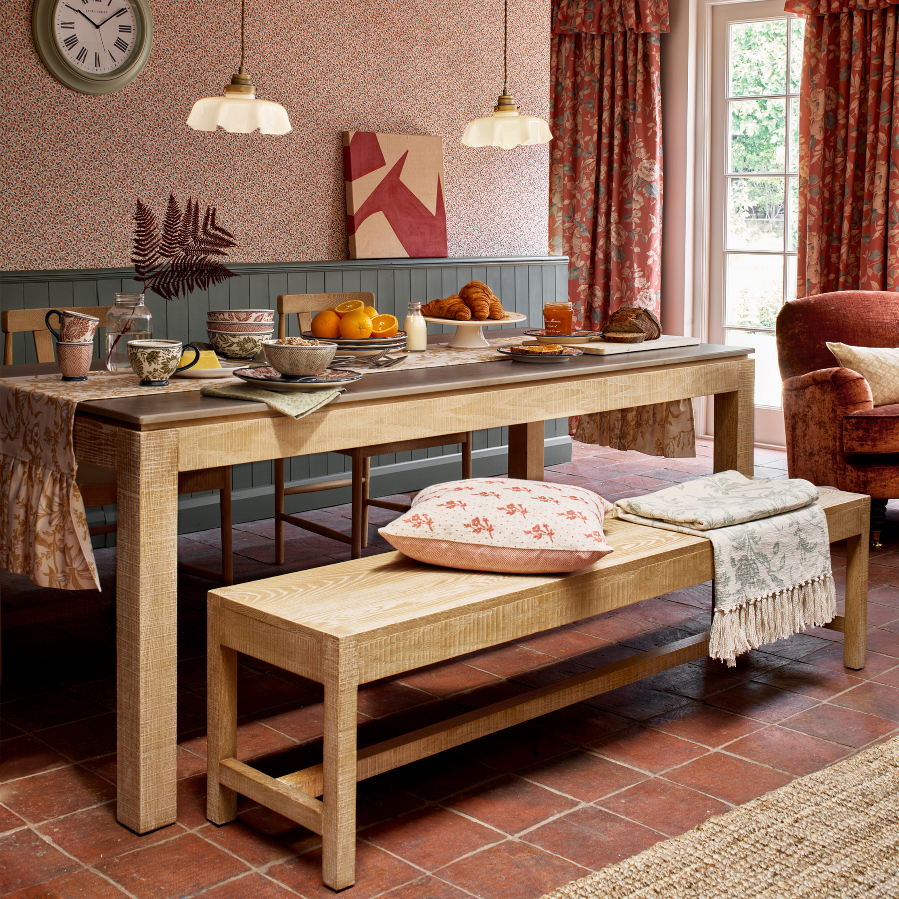 The Laura Ashley Braystone Dining Bench is contemporary and stylish, featuring intricate detailing that makes it a perfect addition to any dining room. Crafted from solid oak and oak veneer with a gently distressed white-washed finish, this gorgeous bench comfortably seats 3 people and perfectly complements the Braystone Dining Table. The unique 'sawn effect' finish gives a distinctive and characterful look.