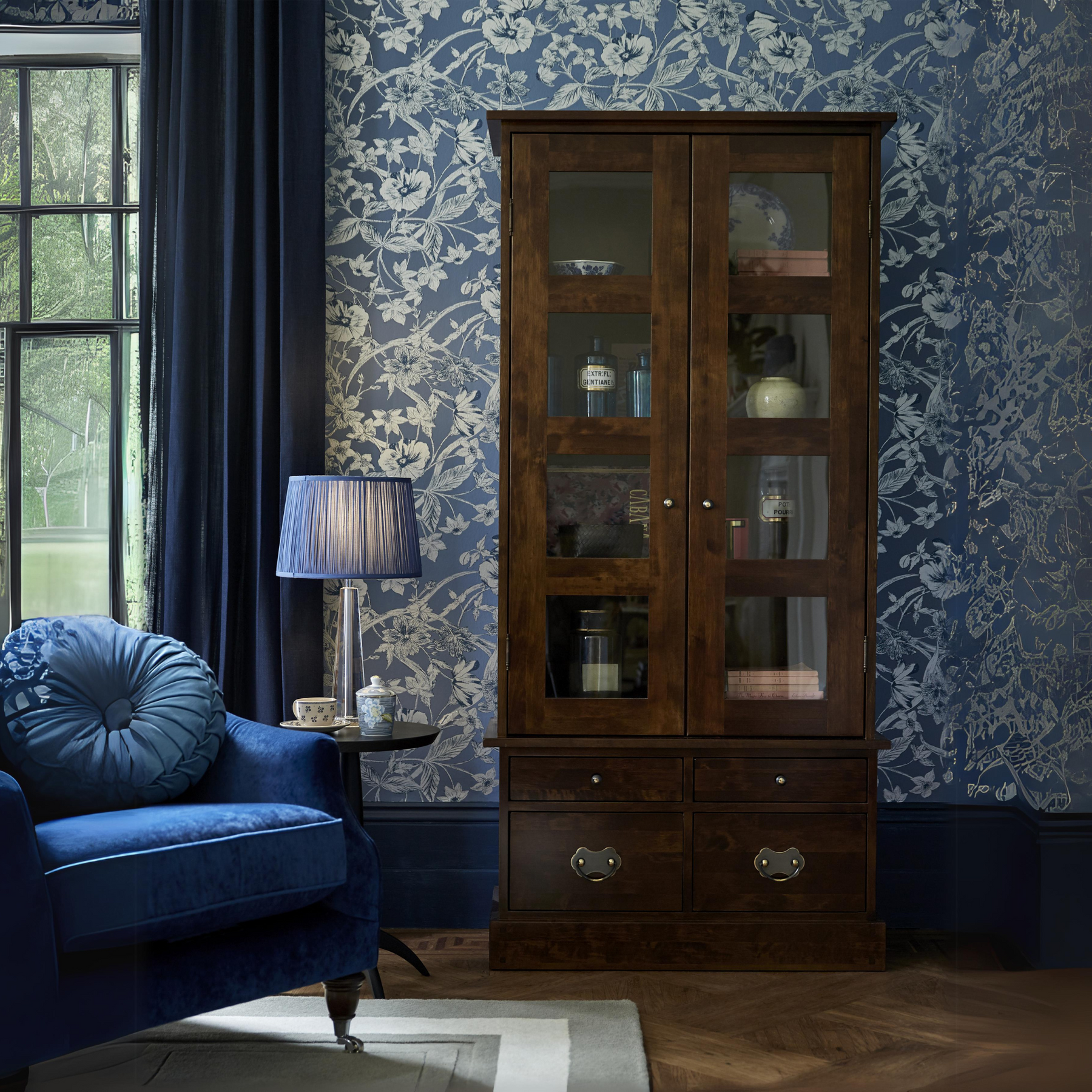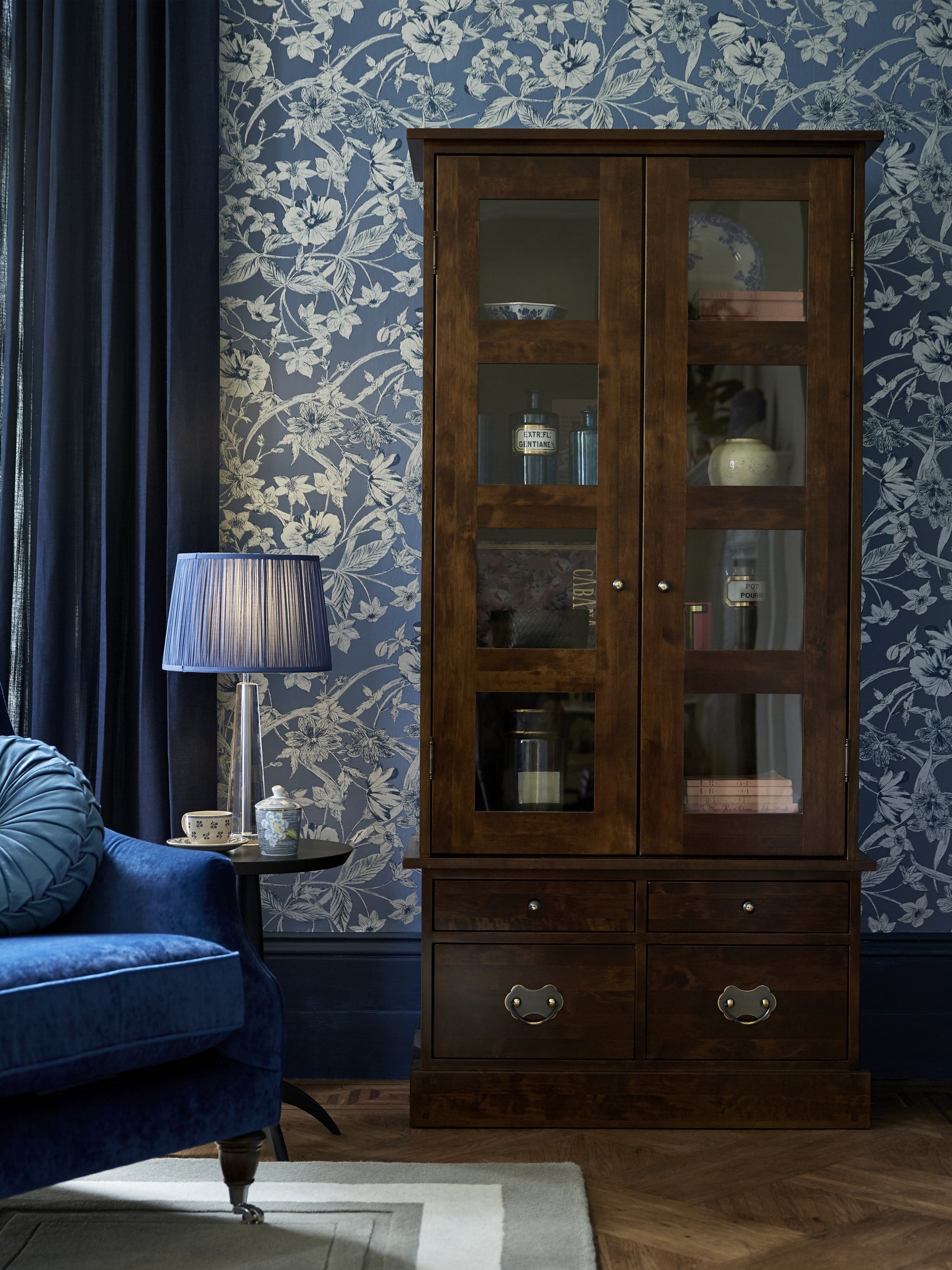 Crafted from predominantly solid birch but with some birch veneer modern materials the Laura Ashley Garrat 2 Door 4 Drawer Display Cabinet cleverly combines the options of storage and display. It benefits from a pair of panel glass doors behind which can be found three adjustable shelves. Beneath the display section there are four drawers; two deep and two small which offer ample storage. The display unit is stained to enhance the natural wood effects is completed with brass effect handles and knobs for an authentic look. Only the top half needs to be positioned and attached to the base to begin enjoying this piece; full assembly is not required.