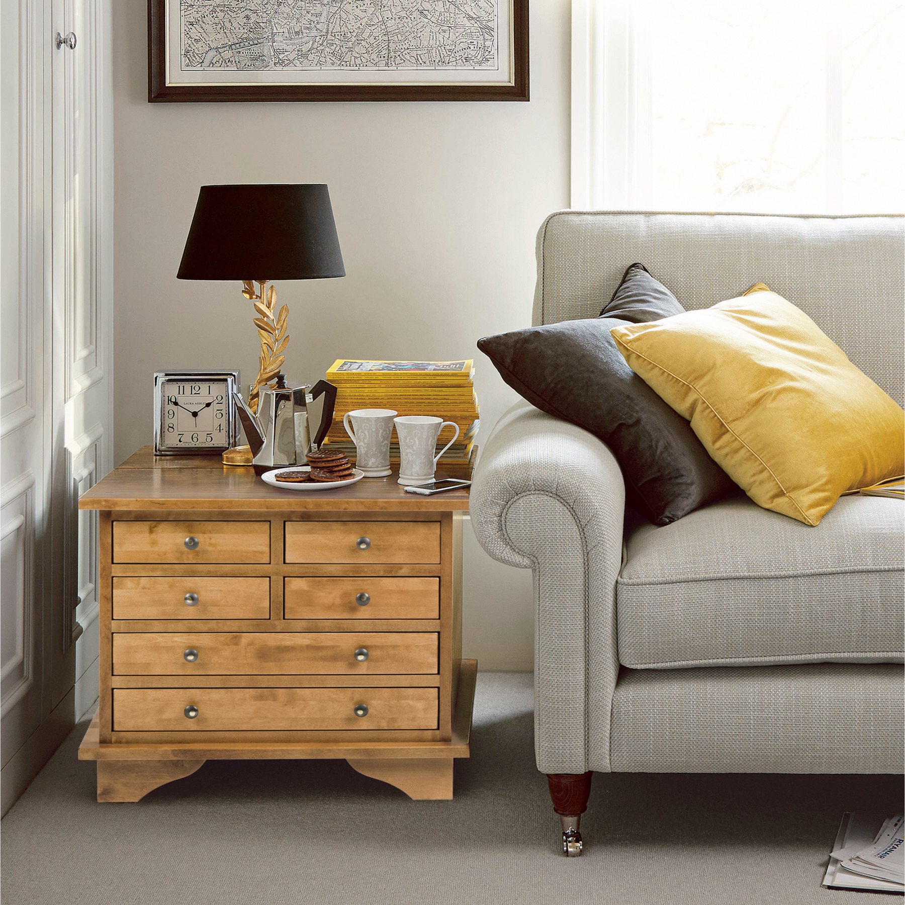 Crafted from predominantly solid birch but with some birch veneer modern materials the Laura Ashley Garrat 6 Drawer Side Table is a versatile addition to suit any home. There are four small drawers and two large ones which provide ample storage space. It has a rippled top and is stained to help enhance the natural wood effects and has brass effect fittings giving it a truly authentic look.
