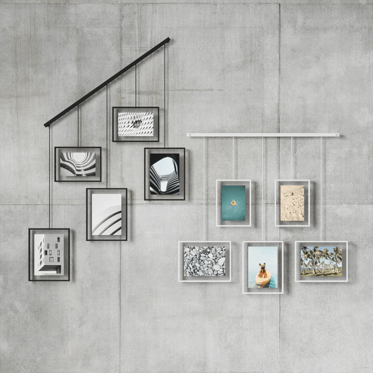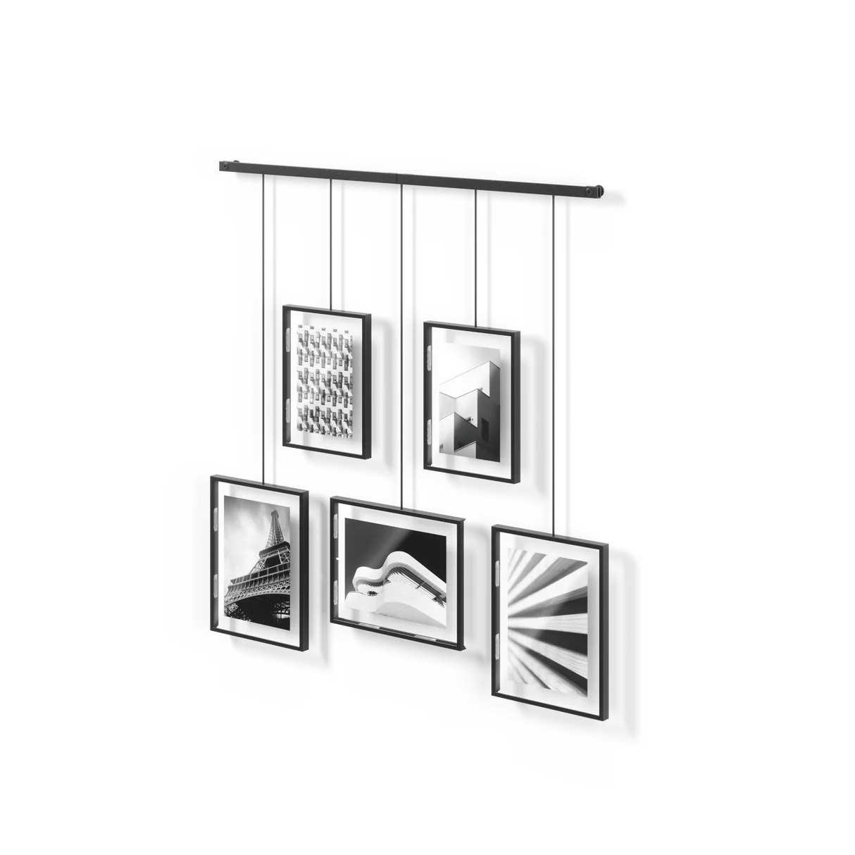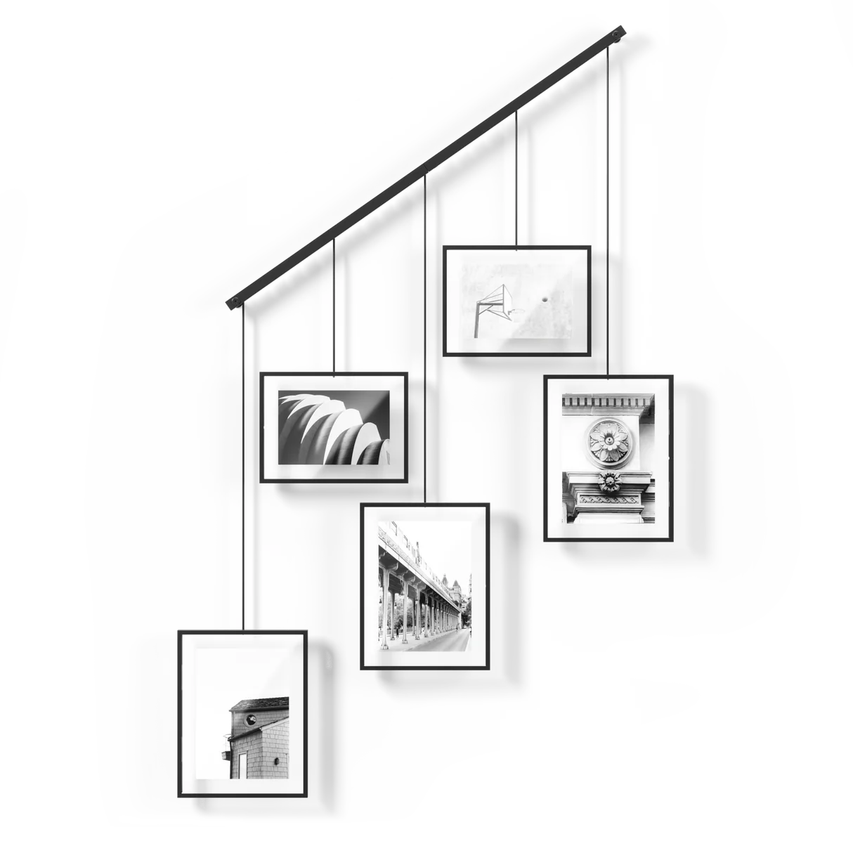 Upgrade your wall decor with Exhibit Photo Display. This sleek, wall-mounted brushed metal ledge is equipped with clips and brackets to securely hold five gallery-style picture frames of various sizes. Say goodbye to unsightly wall damage – Exhibit is designed to minimize any marks left behind. But that's not all – the brackets with the frames are suspended from the ledge, giving you the freedom to create your own unique layouts. Hang it straight or angled, Exhibit is perfect for stairways, adding a modern touch to any space. Place Exhibit in your living room, bedroom, entryway, office, or studio to elevate your home's style. Showcase your favorite photos and artwork while giving the room a fresh, contemporary update. You can easily customize the layout to fit your preferences. Move the picture frames around, rotate them to landscape or portrait orientation – the choice is yours. With two 4x6 frames and three 5x7 frames, you can display all your cherished memories, illustrations, and more. Designed to complement any decor style, Exhibit is not just a wall decor piece – it's a statement. Change out your images effortlessly to refresh your room whenever you feel like it. Upgrade your space with Exhibit Photo Display today.