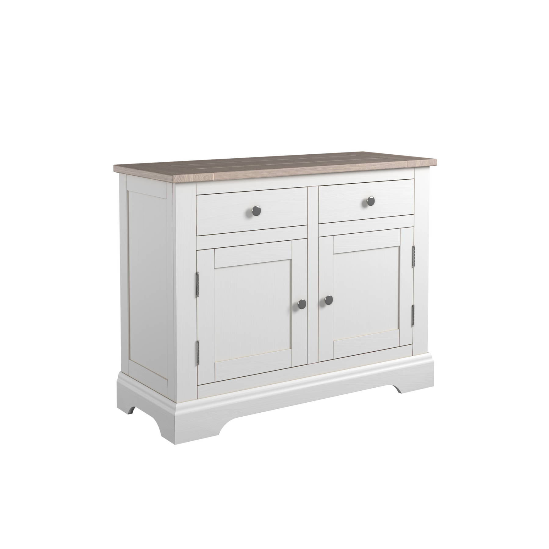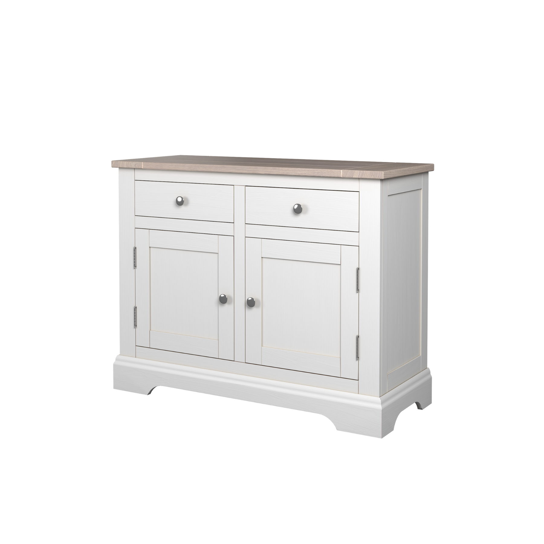 Classically elegant, the hand finished Laura Ashley Dorset 2 Door 2 Drawer Sideboard features a gentle chalky finish that works perfectly with the ash top whilst steel effect handles and hinges add a contemporary twist. And the individual character of the piece is enhanced by lightly distressed edges. Although compact, the sideboard benefits from ample storage space with both cupboard and drawer space aplenty. Â