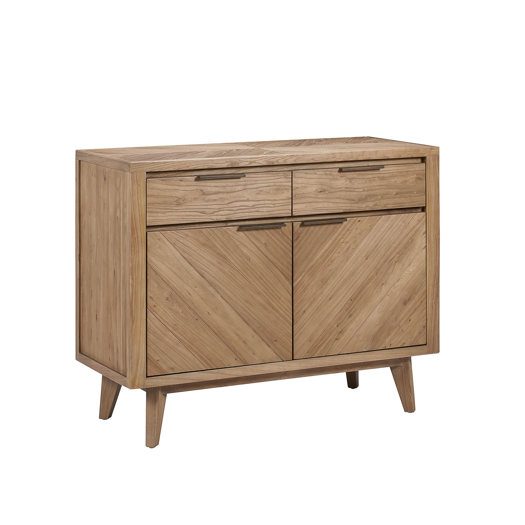 With two generous cupboards concealed behind statement chevron doors, this design offers practical storage within a compact footprint — ideal for dining rooms, hallways or living spaces where impact and functionality are equally important.