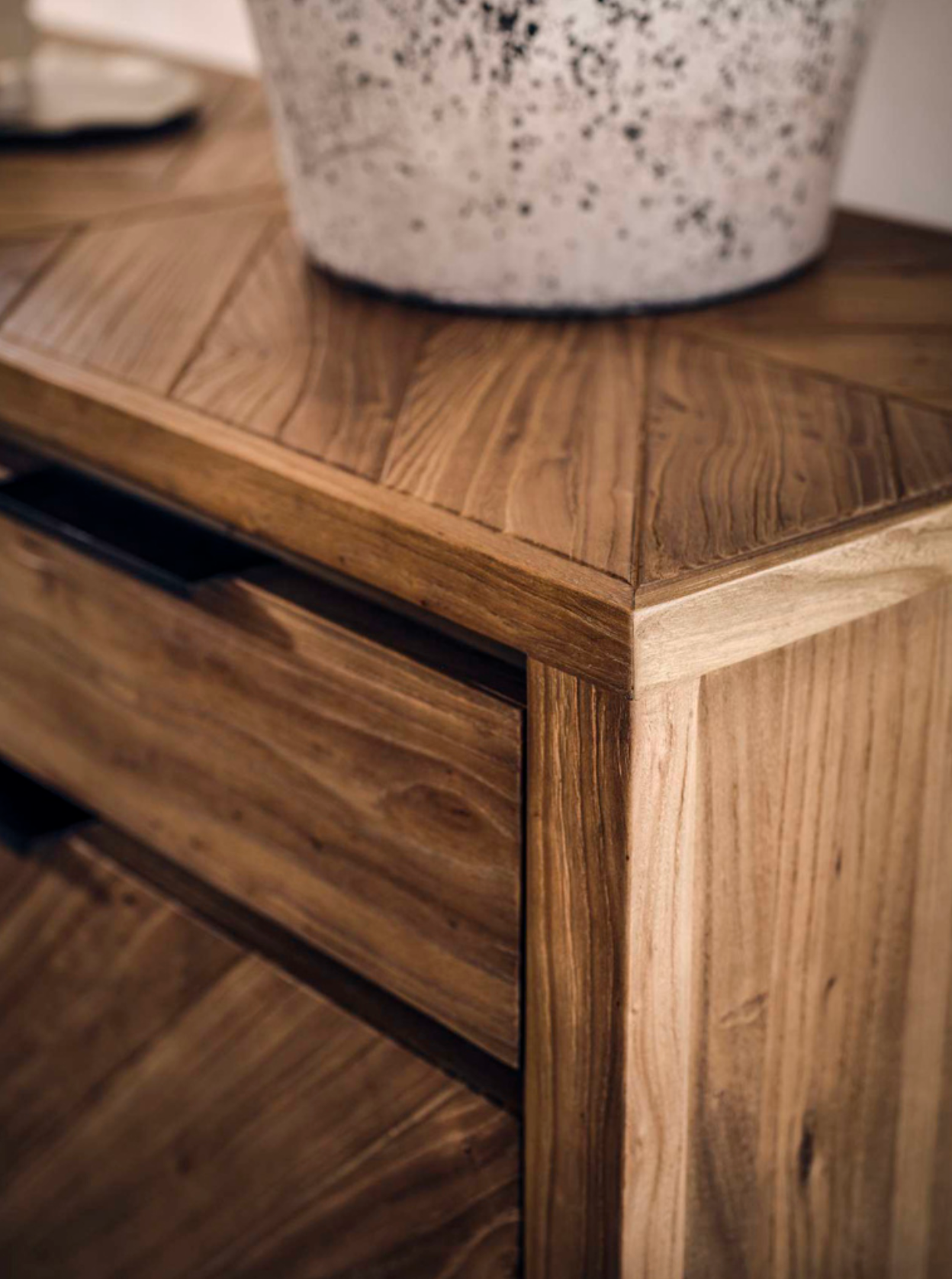 Crafted from solid elm and elm veneers, this striking piece features the collection’s signature chevron planked detailing, beautifully balanced with large-scale elm sections and clean, modern lines. The rich, multi-layered finish enhances the natural grain of the wood, creating depth and tonal variation that feels both elevated and inviting.