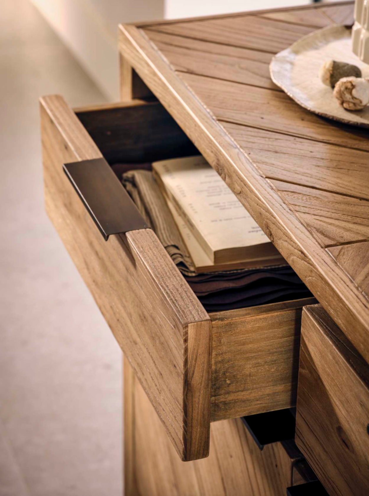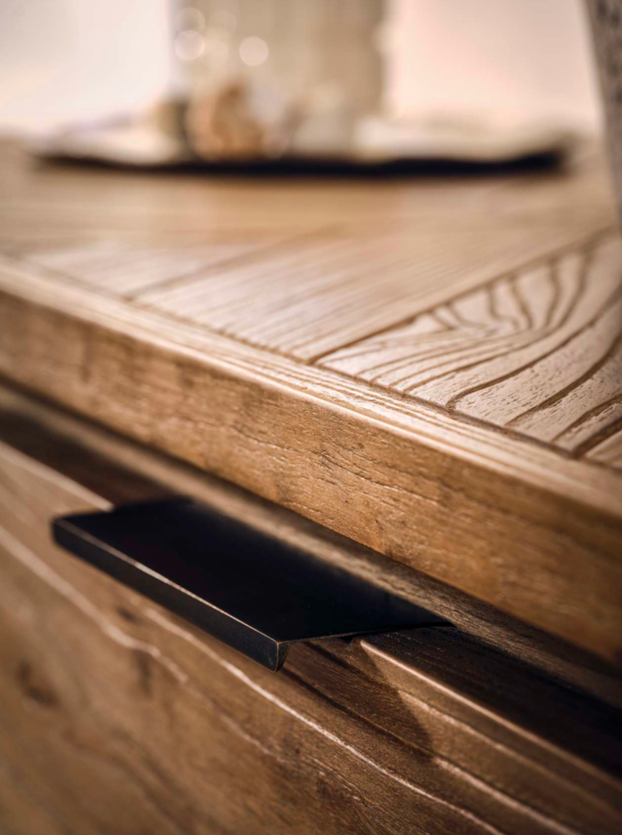 Burnished brass hardware provides a subtle contrast, adding a polished accent to the rustic warmth of the elm.
