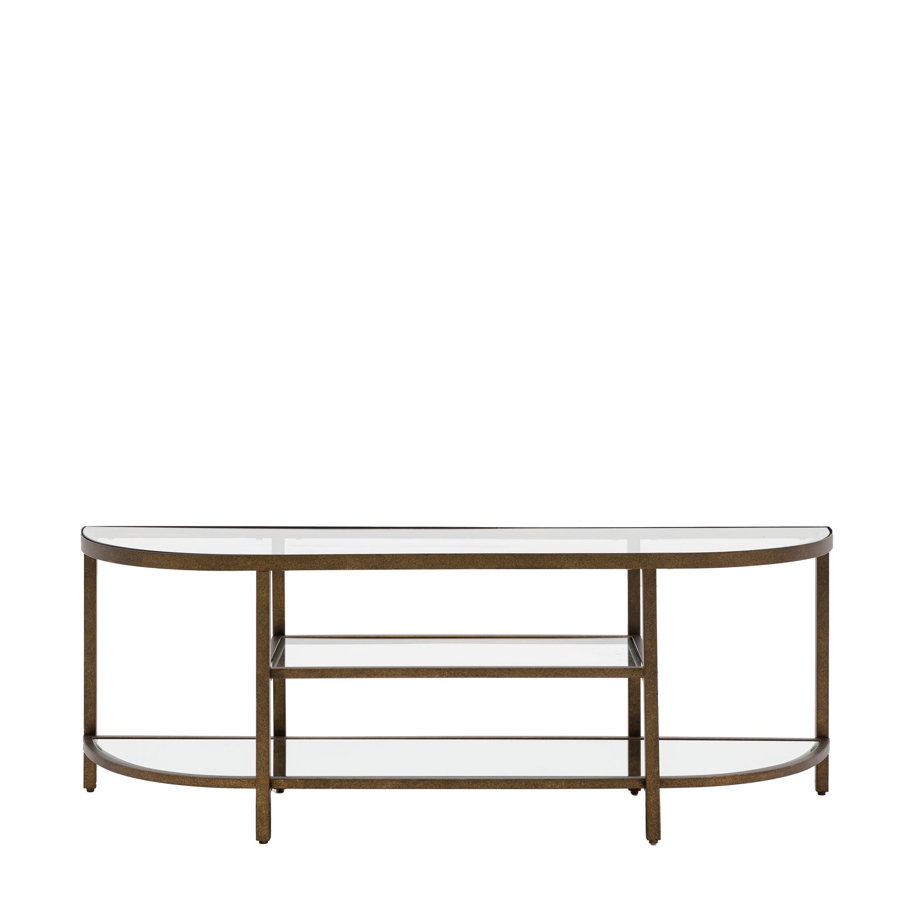 A luxurious low media unit designed to bring refined glamour to your living space. The elegantly curved silhouette creates a soft, sophisticated look, while the combination of glass media shelves and a mirrored lower shelf reflects light beautifully. Set within a sleek metal frame, this statement piece balances practical storage with unmistakable style. Available in vintage bronze or champagne finishes to suit both classic and contemporary interiors.