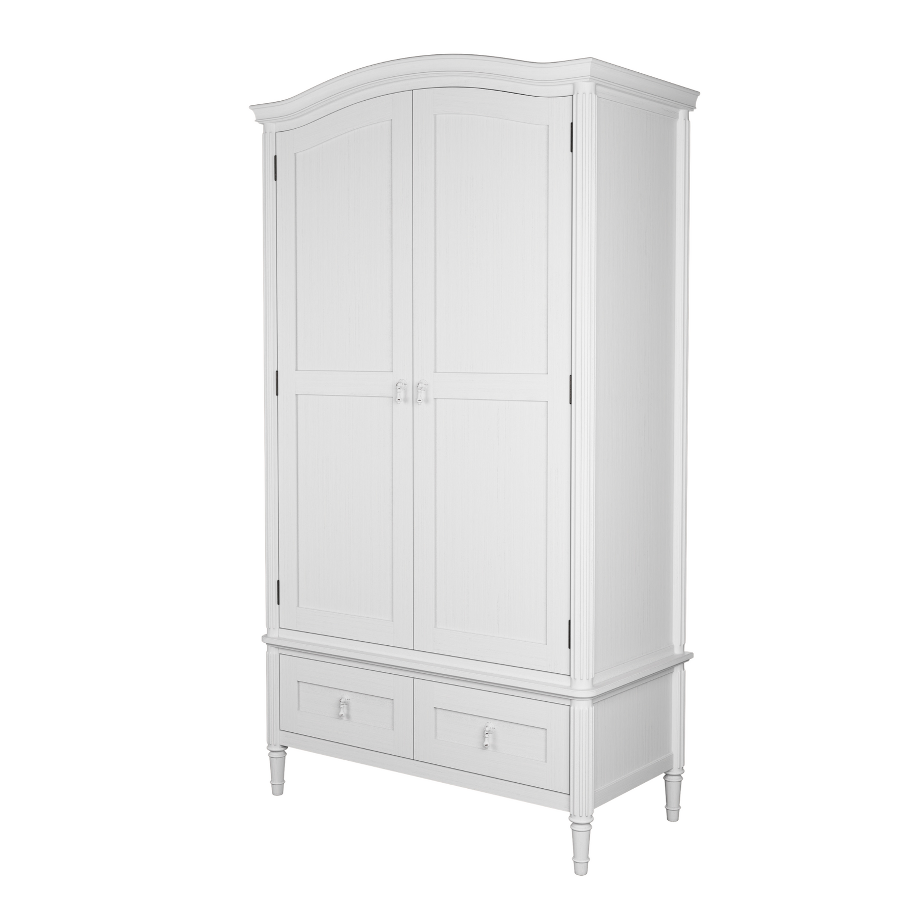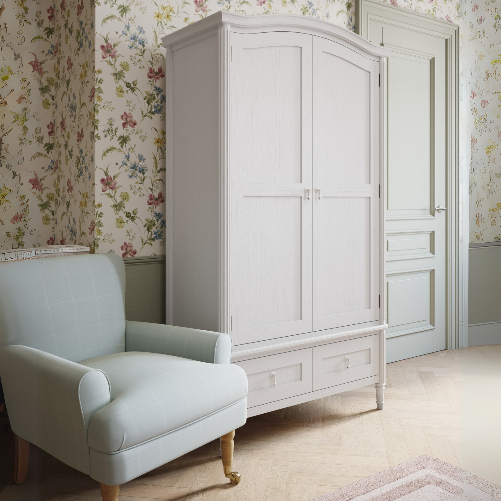 The Laura Ashley Bramford 2 Door, 2 Drawer Wardrobe holds a grand presence in the bedroom, featuring characteristic reeded details and a washed finish. An adjustable hanging rail and shelf provide two interchangeable hanging options behind the panelled doors, along with two deep drawers providing plenty of storage. Featuring a curving and ornately moulded cornice, the design details of the wardrobe are truly unique. The washed paint finish using Laura Ashley Pale Ivory subtly reveals the grain of the hardwood beneath, while the complimentary distressed droplet handles complete the illusion of an heirloom piece from an earlier time.