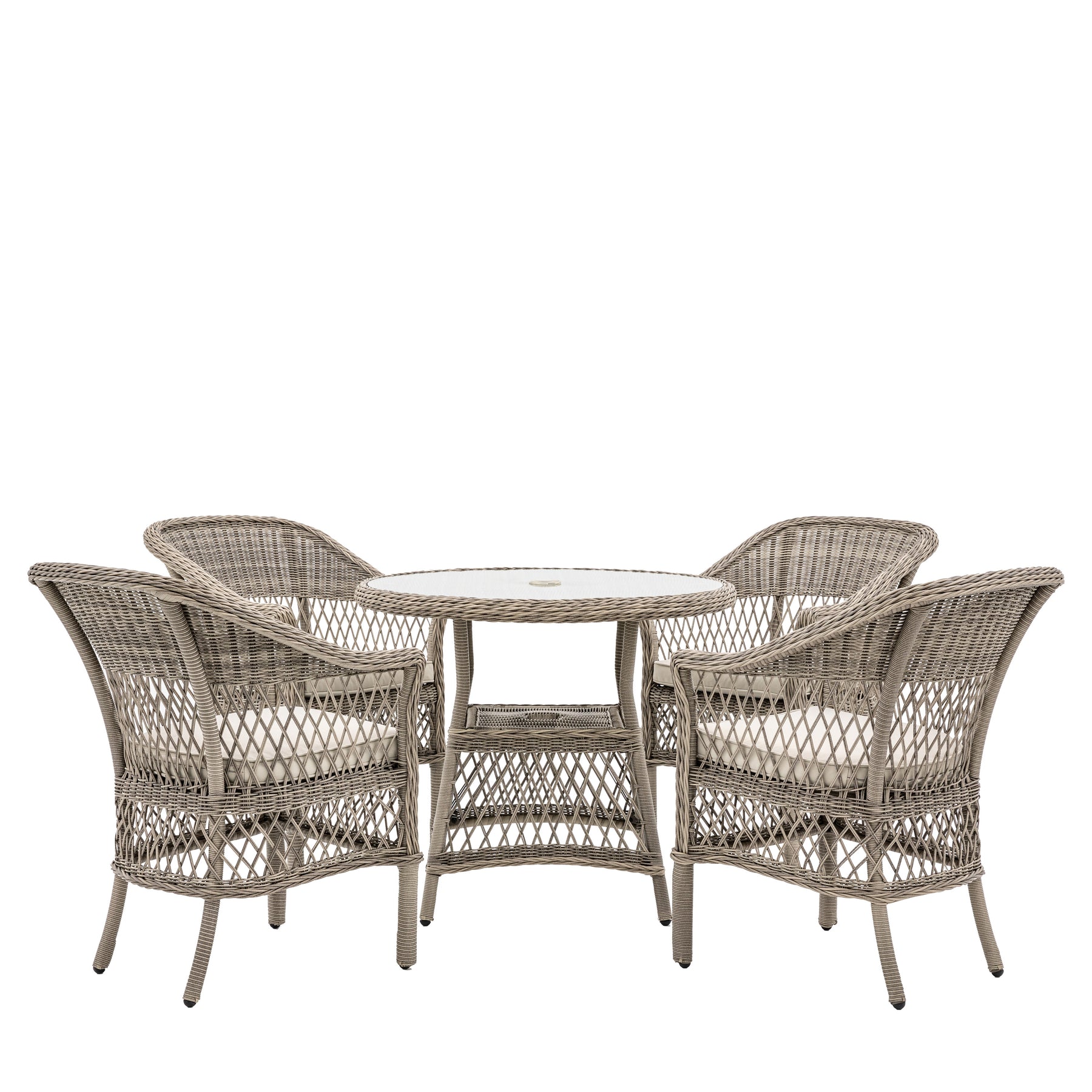Comfortable dining chairs feature supportive armrests and plush shower-resistant cushions, while the round glass-topped table includes a practical lower shelf for additional storage. A central parasol hole allows for shaded outdoor dining on warmer days.