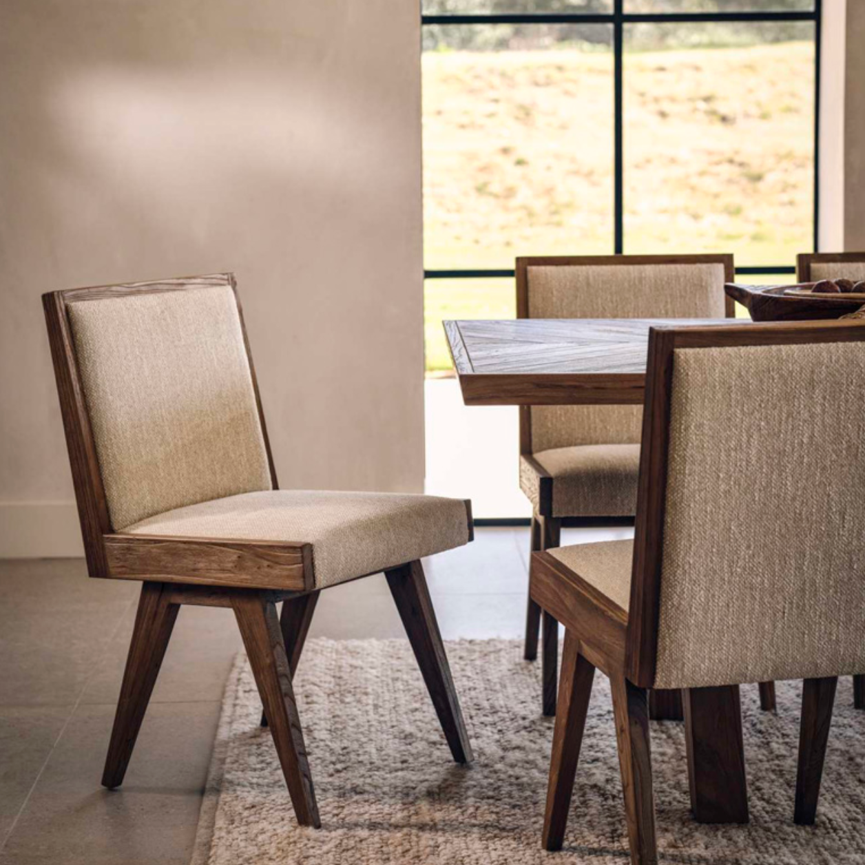 Crafted with solid elm frames, the chairs reflect the collection’s distinctive character, balancing clean contemporary lines with the warmth and texture of natural wood. The rich, multi-layered finish enhances the grain of the elm, creating depth and tonal variation that feels refined yet inviting.